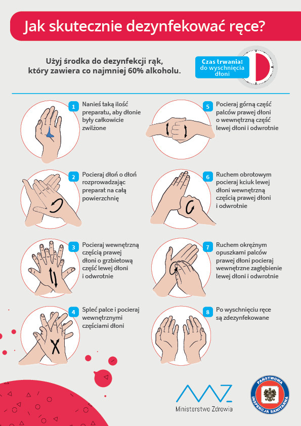 Podczas kaszlu i kichania zakryj usta i nos zgiętym łokciem lub chusteczką – natychmiast wyrzuć chusteczkę do zamkniętego kosza i umyj ręce używając mydła i wody, a jeśli nie masz do nich dostępu – płynów/żeli na bazie alkoholu (min. 60%).